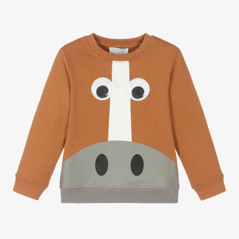 Ideal for horse-lovers, a brown organic cotton sweatshirt for boys by British brand Stella McCartney Kids. Made in soft jersey with a warm, fleecy inside, it has a horse face printed on the front in white and grey, with fun eyes that move. The top has long sleeves and cosy ribbed trims. The Stella McCartney fit can be quite small so choose a size up if you want room to grow.