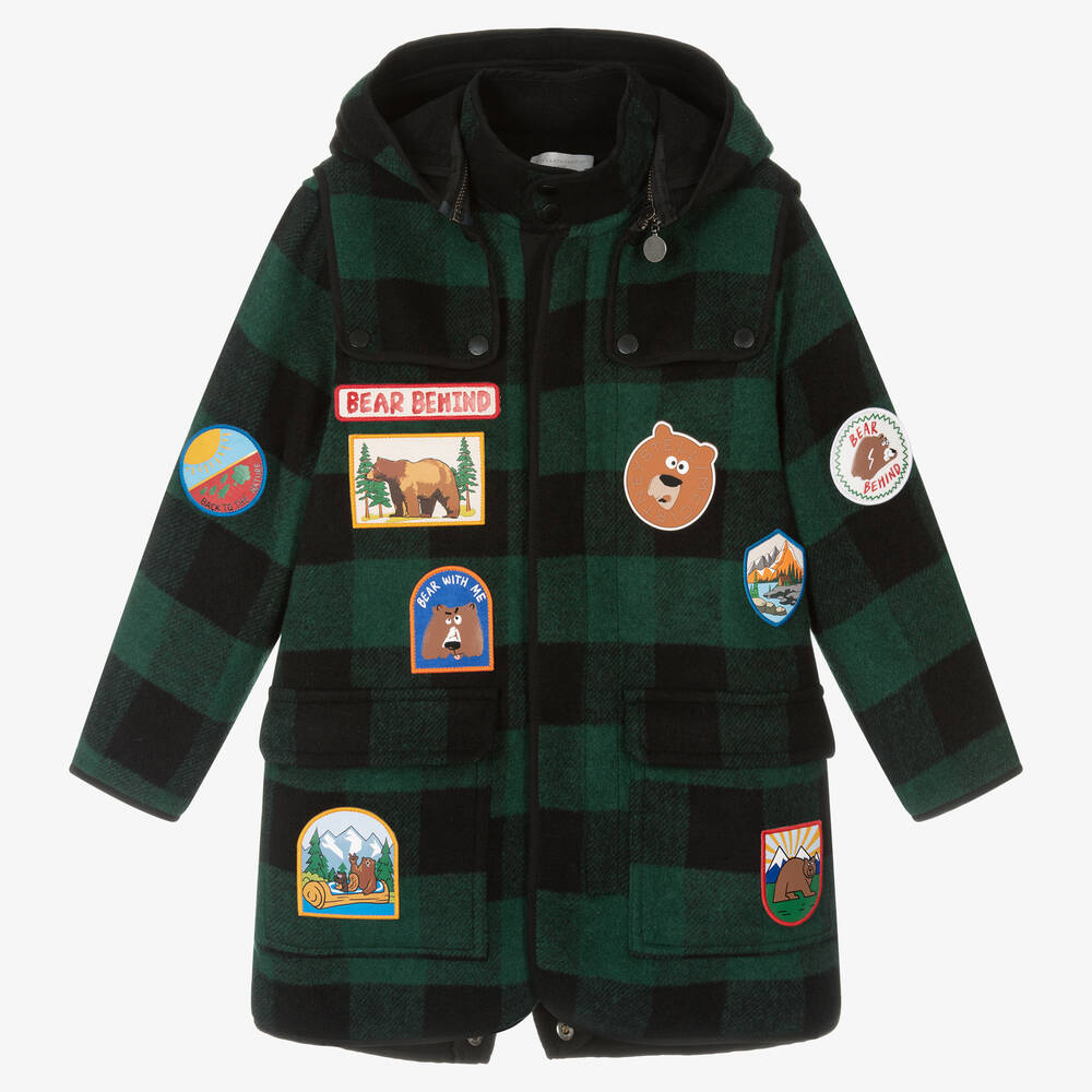 Decorated with fun and colourful bear-themed badges, this black and green check coat for boys is by Stella McCartney Kids. Woven in a soft wool blend, it has a warm and cosy feel. There is a detachable shoulder overlay which fixes onto the coat with poppers. Attaching to the overlay is a removable hood which fastens on with a zip. This cool coat has a concealed zip down the front, with deep patch pockets and a popper fastening vent on the back. The Stella McCartney fit can be quite small so choose a size up if you want room to grow.