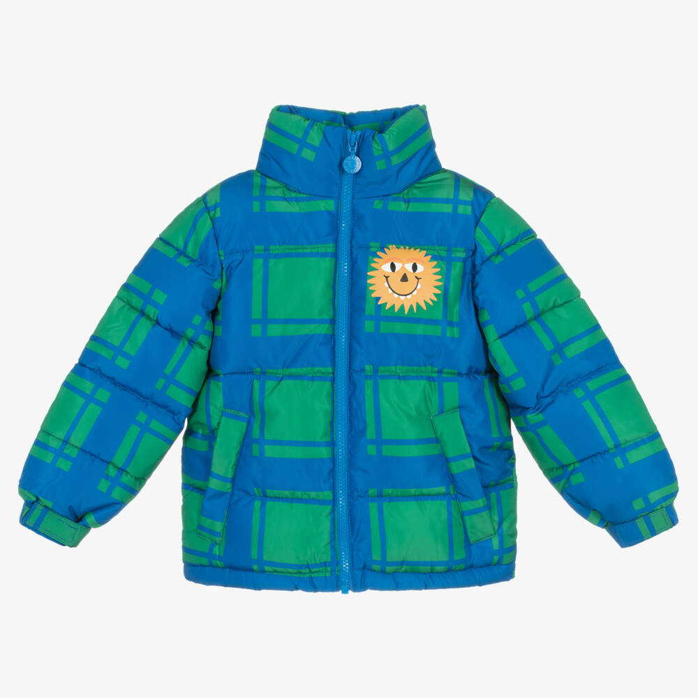 A blue and green check puffer jacket for boys by Stella McCartney Kids, made in a smooth recycled fabric. It has a friendly yellow monster printed on the chest for a playful designer vibe. The soft fleece lining, velcro cuffs and adjustable toggle waistband ensures cosiness in cold weather. The front and pockets fasten easily with a zip, and the hood folds away neatly under the collar. The Stella McCartney fit can be quite small so choose a size up if you want room to grow.