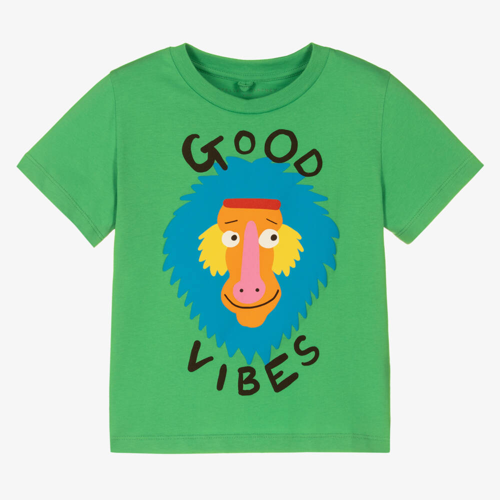 Fun green organic cotton T-shirt for boys by British brand Stella McCartney Kids, with a blue monkey and 'Good Vibes' printed in black on the front. Made in comfortable jersey, it is just right for all-day wear.