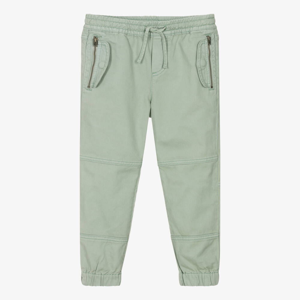 Pale green trousers for boys by Stella McCartney Kids, made in soft cotton twill. In a comfortable relaxed fit, the trousers have a drawstring waist and gently elasticated ankle cuffs. There are zipped pockets with flap detailing on the front, and patch pockets on the back. A brown logo tab is stitched to the back for a finishing designer touch. The Stella McCartney fit can be quite small so choose a size up if you want room to grow.
