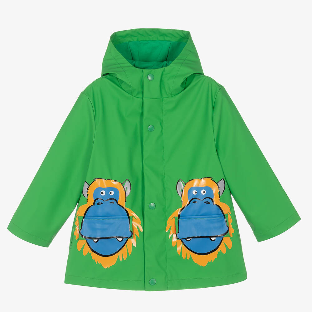 Fun bright green hooded coat for boys by Stella McCartney Kids, with eye-catching blue and yellow monkey prints on the front. Made in smooth and water-repellent coated recycled fabric, it fastens with a zip and branded poppers on the front and has useful flap pockets. The Stella McCartney fit can be quite small so choose a size up if you want room to grow.