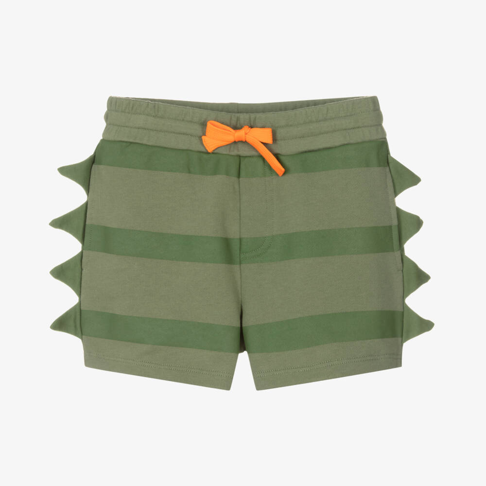 Striped shorts for boys in contrasting shades of green, by British designer, Stella McCartney Kids. Made in comfortable organic cotton sweatshirt jersey, they have useful concealed side pockets and fun 3D 'spine' detail along the side seams. The waistband is elasticated and fastens with a vibrant orange drawstring for an adjustable fit. The Stella McCartney fit can be quite small so choose a size up if you want room to grow.
