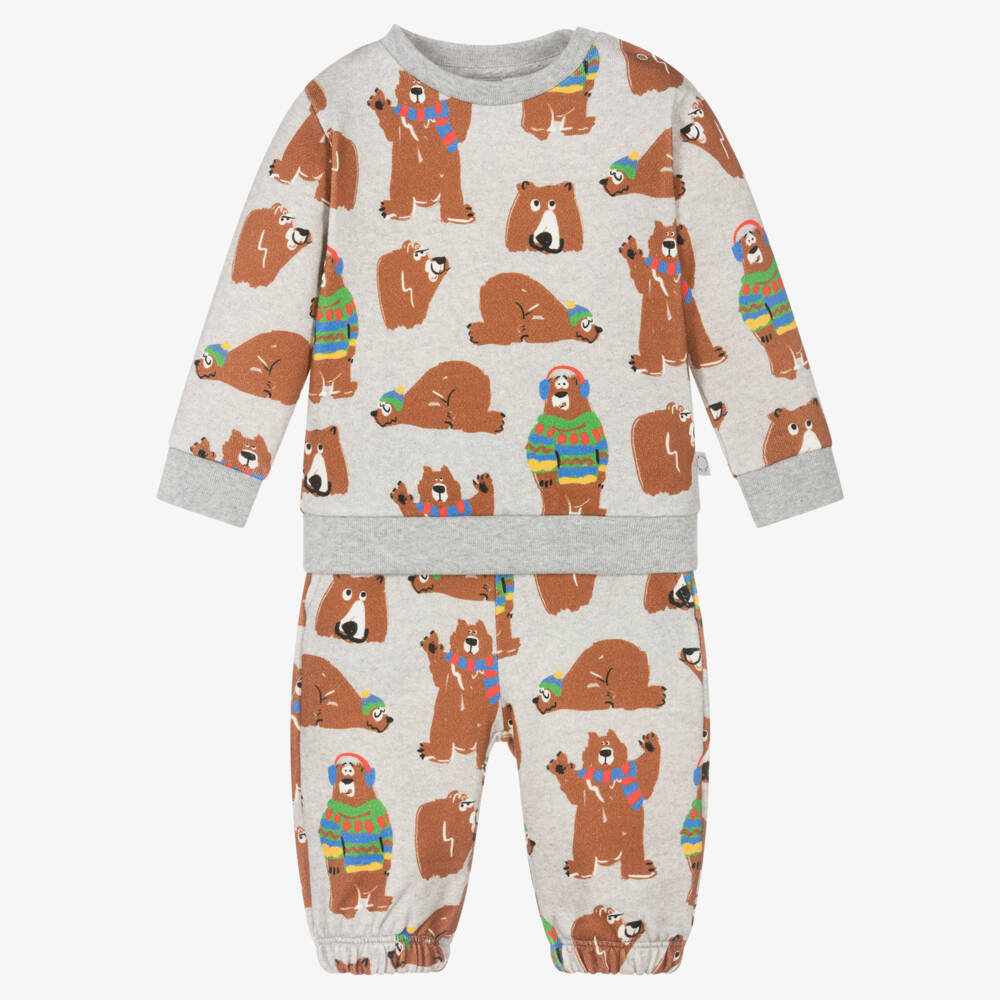 A grey organic cotton tracksuit for little boys by Stella McCartney Kids, patterned with an adorable brown bear print. Made from soft jersey with a fleecy inside, the sweatshirt has practical popper fastenings on the shoulder, and grey elasticated trims for extra comfort. The joggers have stretchy cuffs, a drawstring waist, and useful pockets on the front. The Stella McCartney fit can be quite small so choose a size up if you want room to grow.