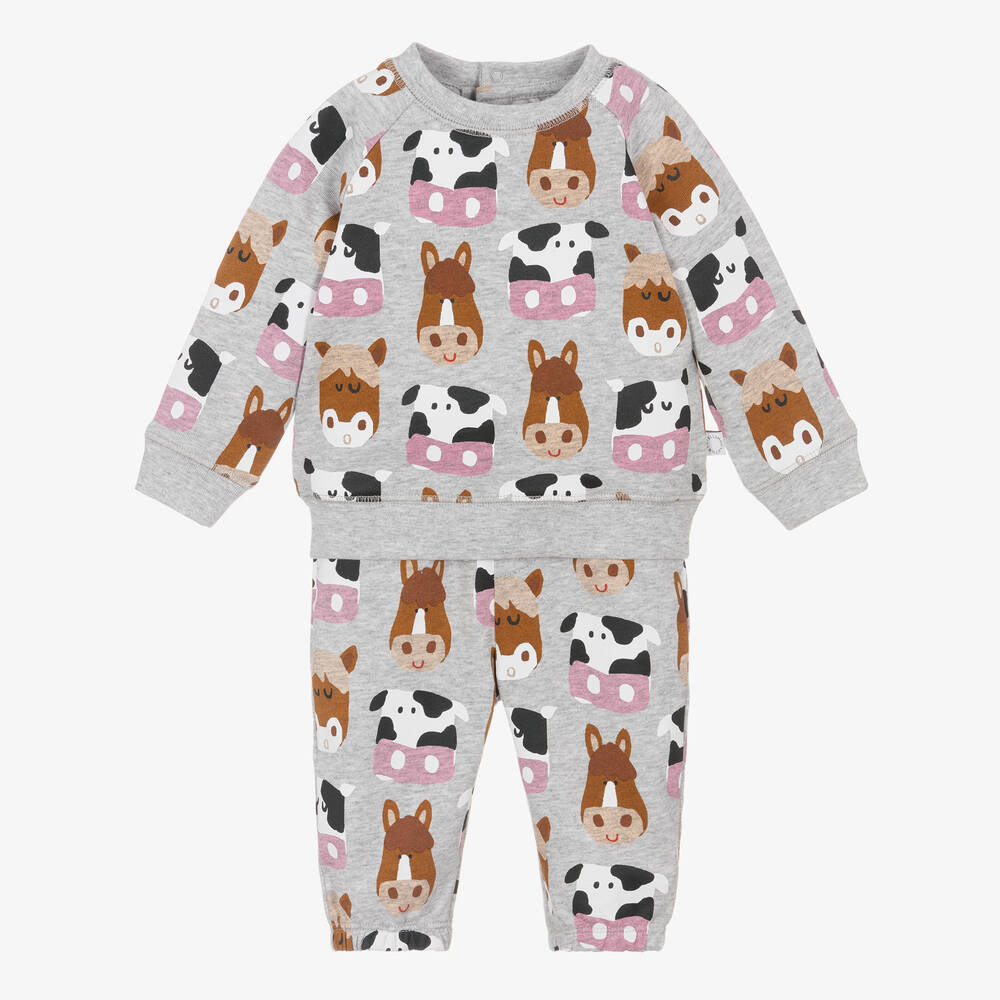 Featuring a fun farm animal print of horses and cows, this grey marl tracksuit for little boys is by Stella McCartney Kids. Casual and comfortable, it is made in soft organic cotton jersey with a cosy fleecy inside. The top fastens with poppers on the back and the trousers have an elasticated drawstring waist for an ideal fit. The Stella McCartney fit can be quite small so choose a size up if you want room to grow.
