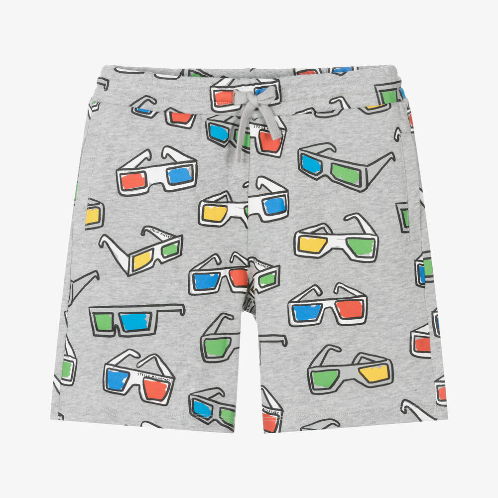 Fun grey shorts for boys by Stella McCartney Kids, made from soft organic cotton jersey. They have a vibrant and colourful 3D glasses print, with the brand's signature logo carefully detailed in the design. A drawstring fastens comfortably on the waist and there are pockets on the side seams and on the back. The Stella McCartney fit can be quite small so choose a size up if you want room to grow.