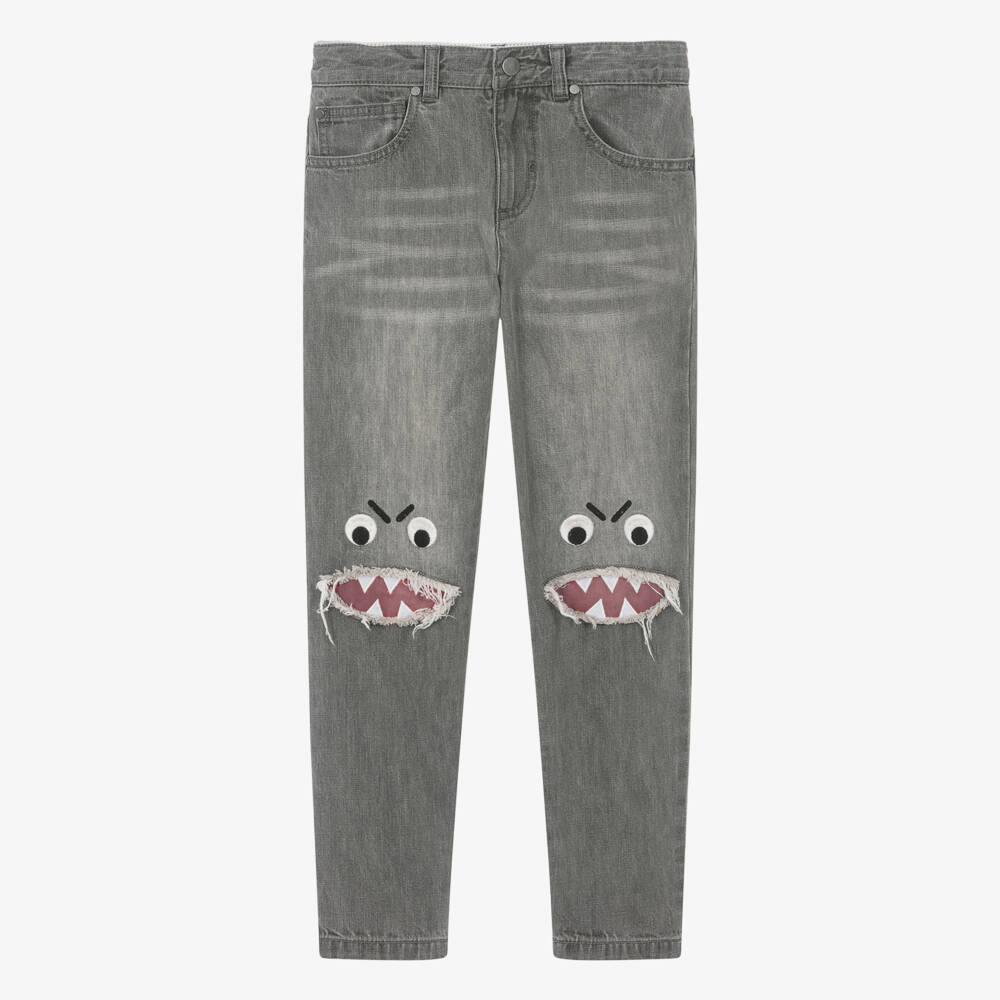 Washed grey denim jeans for boys by Stella McCartney Kids, made from soft organic cotton. Adding a fun twist to a classic style, these trousers have sharks on each knee with frayed edging on the mouth for an edgy look. They have five-pocket styling and a logo tab on the back. Fastening with a hook and zip, an adjustable waist completes the design. The Stella McCartney fit can be quite small so choose a size up if you want room to grow.