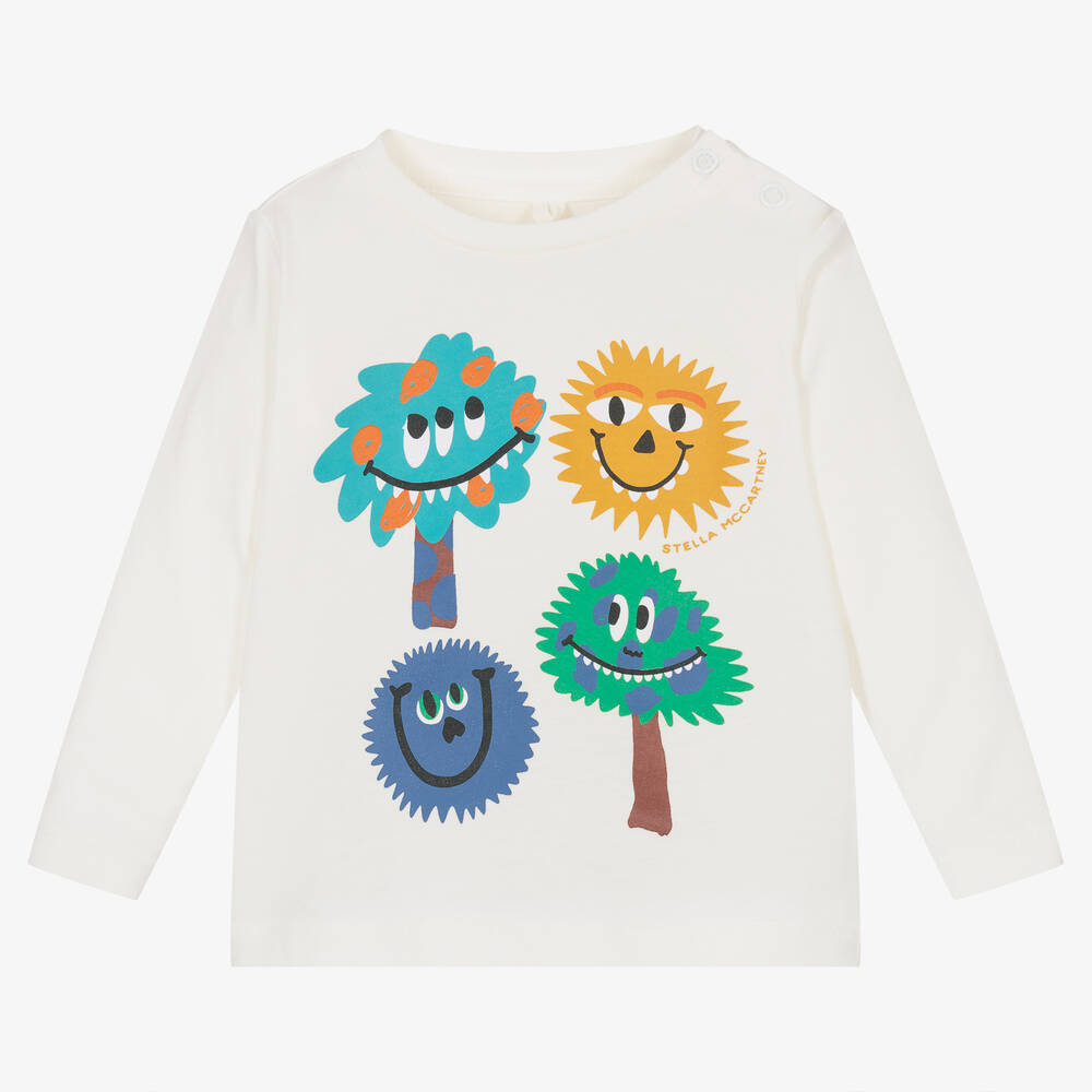 Fun ivory top for little boys by British designer, Stella McCartney Kids. Made in soft organic cotton jersey, it has a colourful monster motif for a playful look. The brand's logo can be found in a mustard yellow shade on the front, and it fastens with ease-to-use poppers on one shoulder. The Stella McCartney fit can be quite small so choose a size up if you want room to grow.