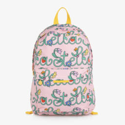 Orange backpack for boys by Stella McCartney Kids, patterned with quirky, green logo letter characters. Fastening with branded zips, this practical bag is made from silky smooth, recycled fabric with a spacious main compartment and a smaller front pocket. It has lightly padded, adjustable shoulder straps and a useful handle on the top.