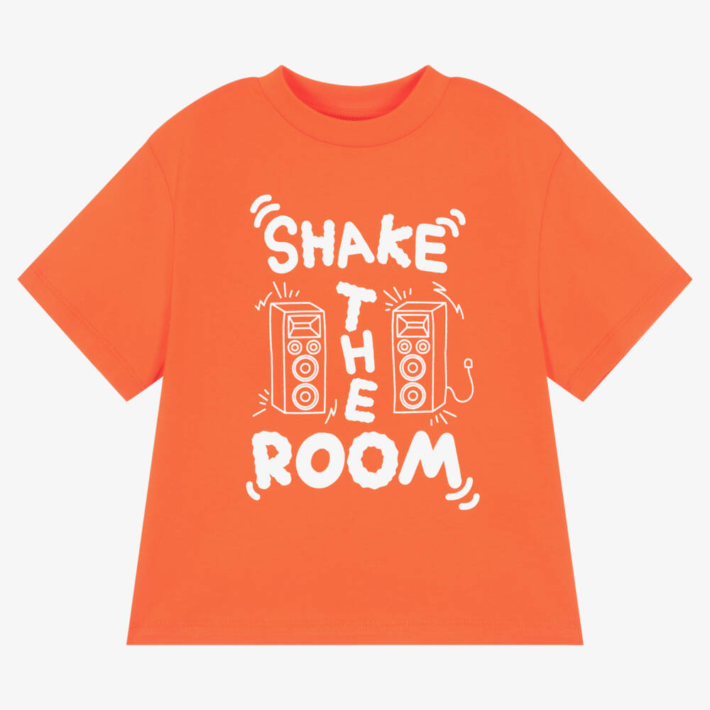 Boys red crew neck T-shirt by Stella McCartney Kids, made in soft organic cotton jersey. The front is printed with a fun speaker artwork and has a 'Shake the Room' slogan for a playful finish.
