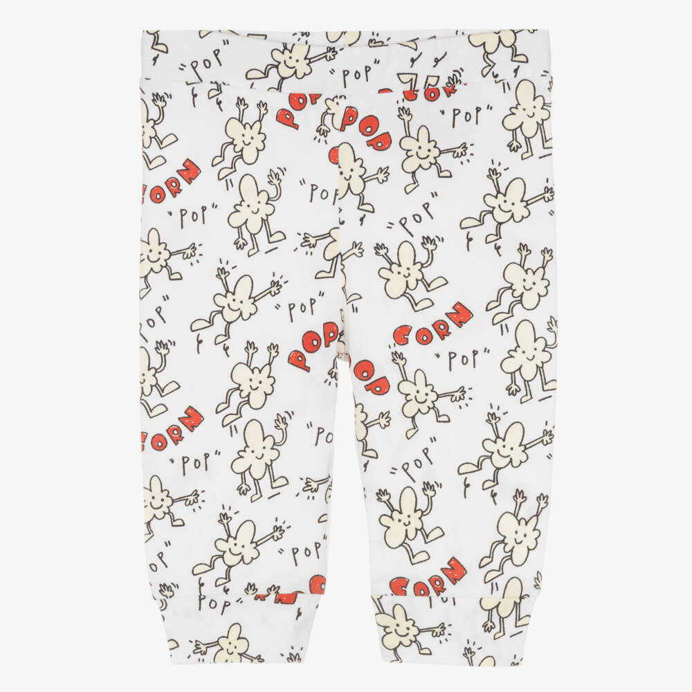 Fun white joggers for little boys, by Stella McCartney Kids, with a quirky popcorn design. They are made in the softest organic cotton jersey, with an elasticated waistband for easy and convenient wear. The Stella McCartney fit can be quite small so choose a size up if you want room to grow.