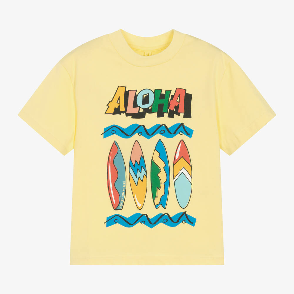 Pastel yellow, short-sleeved T-shirt for boys by Stella McCartney Kids, made in soft and comfortable organic cotton jersey. It has a vibrant 'Aloha' and surfboard graphic in bold colours, with the designer's name subtly incorporated within the print. The Stella McCartney fit can be quite small so choose a size up if you want room to grow.