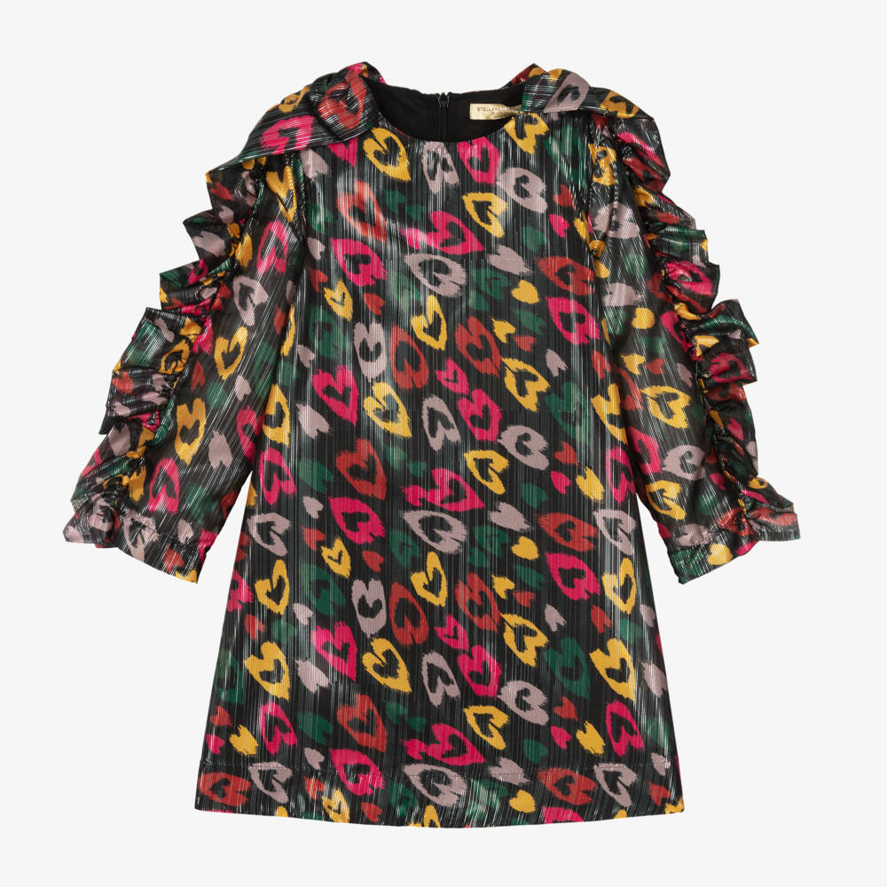 A striking black dress for girls by Stella McCartney Kids, made in lightweight and silky recycled fabric. Interwoven with shiny metallic stripes, this dress has a colourful abstract heart pattern for a lovely festive feel. It has eye-catching ruffled trims down the sleeves, and a concealed zip fastening on the back. The soft cotton voile lining comfortably finishes the look. The Stella McCartney fit can be quite small so choose a size up if you want room to grow.