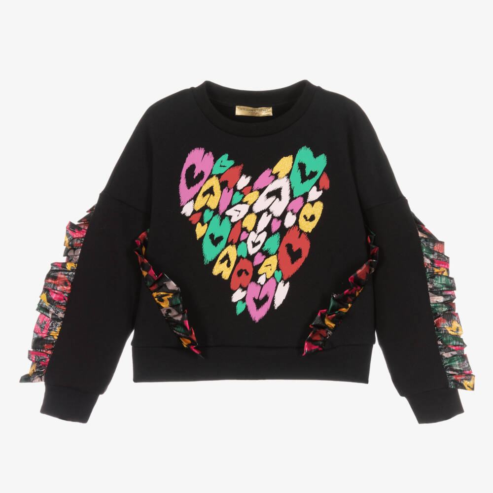 A cute black sweatshirt for girls by Stella McCartney Kids, made from soft organic cotton jersey. Playfully printed on the front is a colourful abstract love heart, with eye-catching glittery detailing and ruffled metallic trims. The Stella McCartney fit can be quite small so choose a size up if you want room to grow.