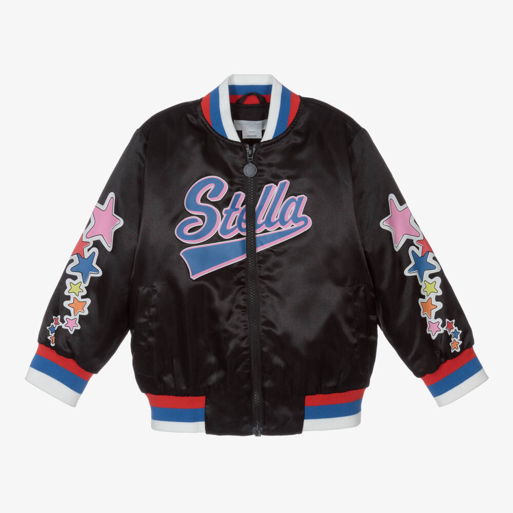 Chic black satin bomber jacket for girls by British designer Stella McCartney Kids. Silky, with a lovely sheen, it has a sporty pink logo print on the front and colourful stars on the sleeves. A black branded zip and red, white and blue striped trims give this cool jacket a clean finish.