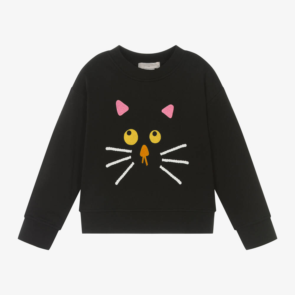 Fun black sweatshirt for girls by Stella McCartney Kids, made in soft, mid-weight jersey, with a warm, fleecy inside. This casual top has cosy ribbed trims and a colourful cat face on the front with a felted nose, eyes and ears. The Stella McCartney fit can be quite small so choose a size up if you want room to grow.