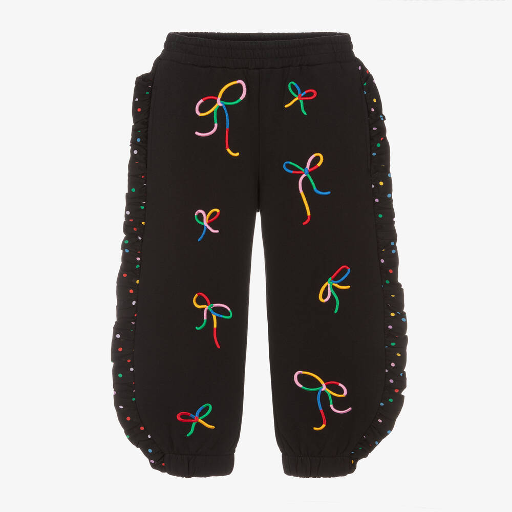Girls black joggers by Stella McCartney Kids, made from organic cotton jersey with a fleecy inside. Embroidered with rainbow bows, this fun design features ruffled trims on each leg with red, purple and blue polka dots. They have a stretchy waistband and elasticated cuffs for extra comfort. Handy side seam pockets provide space for small belongings. The Stella McCartney fit can be quite small so choose a size up if you want room to grow.
