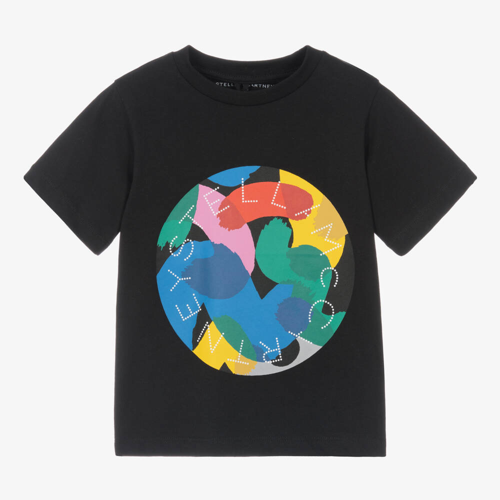 A black T-shirt for girls by Stella McCartney Kids, made from soft organic cotton jersey. Adding a pop of colour, this casual top has a circular logo printed on the front. The Stella McCartney fit can be quite small so choose a size up if you want room to grow.