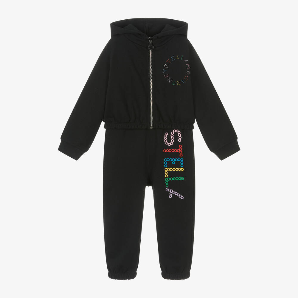 Eye-catching black organic cotton tracksuit for girls by British brand Stella McCartney Kids, made in comfortable jersey with a cosy, fleecy inside. Unmistakably by the designer, it is boldly embellished with embroidered logos across the back of the hoodie and on one leg. The hoodie has spacious, batwing sleeves and a printed, circular logo on the chest. The joggers have a comfortable, elasticated waistband and useful, concealed pockets on the side seams. The Stella McCartney fit can be quite small so choose a size up if you want room to grow.