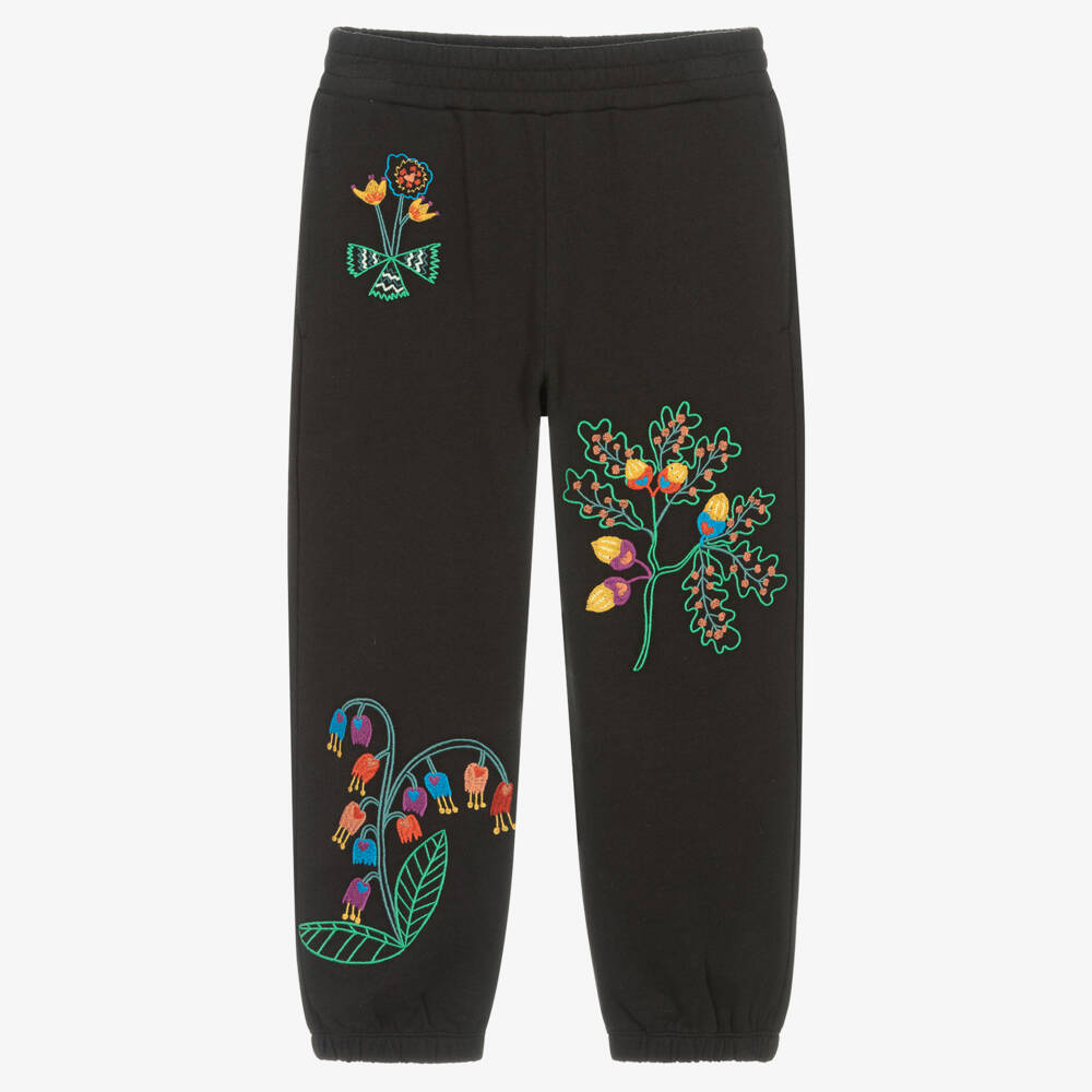 Gorgeous black joggers for girls by British designer Stella McCartney Kids. Just right for adding interest to casual wardrobes, they are embroidered with colourful, folklore-inspired acorns, oak leaves and flowers. Made in soft, comfortable, organic cotton jersey, they have an elasticated waistband and useful, concealed side pockets. The Stella McCartney fit can be quite small so choose a size up if you want room to grow.