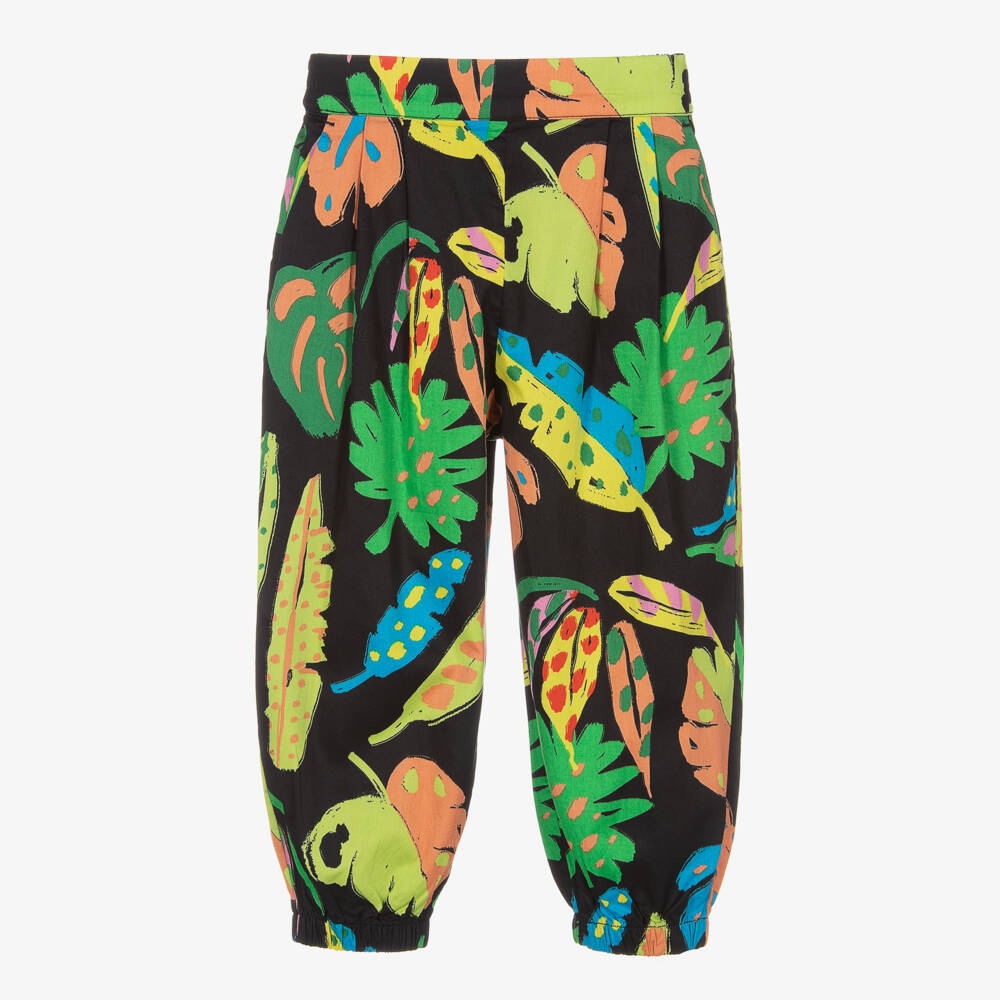 Black trousers for girls by Stella McCartney Kids, made in soft organic cotton poplin. In a loose and relaxed harem style, these lightweight trousers are patterned in a vibrant palm leaf design. There are box pleats and side seam pockets, with elasticated trims for an easy-to-wear style. The Stella McCartney fit can be quite small so choose a size up if you want room to grow.