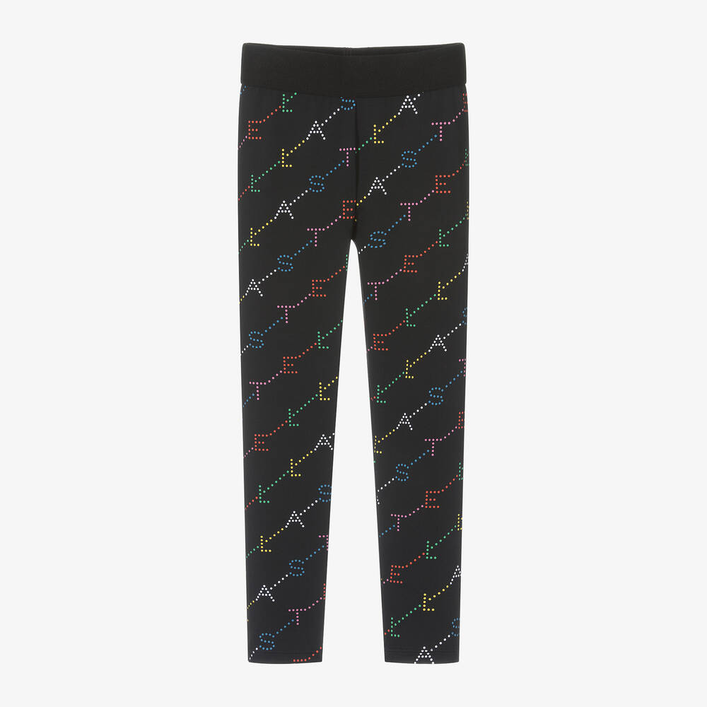 Black leggings for girls by Stella McCartney Kids with a colourful, diagonal logo design for instant designer appeal. Silky and stretchy, this sporty style is made from recycled material, ideal for casual, comfortable wear. The Stella McCartney fit can be quite small so choose a size up if you want room to grow.