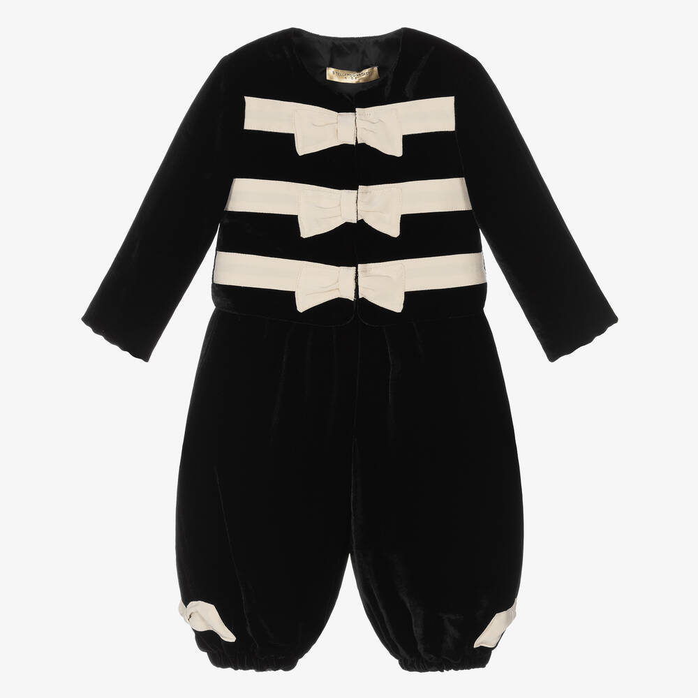 Girls black velvet trouser set by Stella McCartney Kids. Super soft to touch, the collarless jacket has ivory silk chiffon bow appliqués across the front, with hook and eye fastenings. The matching pedal pusher style trousers are knee length and have elasticated cuffs and waistband with a matching ivory bow trims.