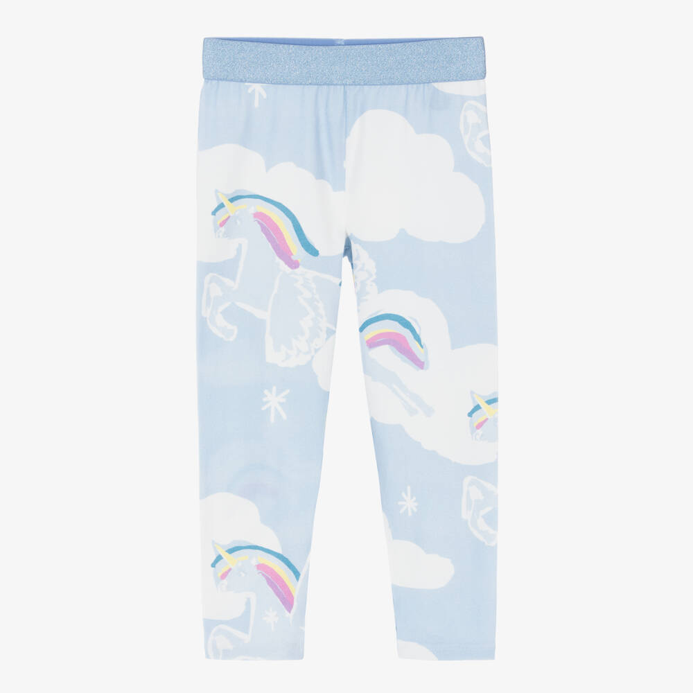 Pale blue organic cotton leggings for girls by British brand Stella McCartney Kids. Made in comfortable, stretchy jersey, they are patterned with white unicorns that have rainbow manes and tails, flying through clouds. Full length, they have an eye-catching, glittery blue, elasticated waistband. The Stella McCartney fit can be quite small so choose a size up if you want room to grow.