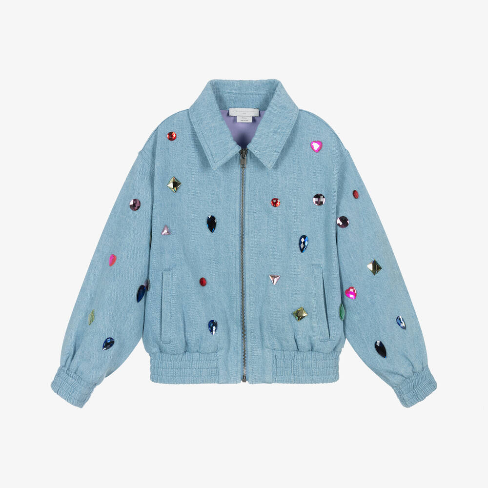 Ideal to brighten up her casual wardrobe, a fun denim jacket for girls by Stella McCartney, sparkling with colourful jewels. Made in organic cotton, in a light blue wash, it has` useful front pockets and a lilac purple lining.