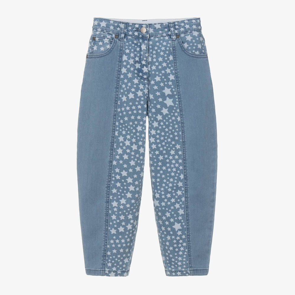 Blue denim jeans for girls by Stella McCartney Kids, made in soft organic cotton, patterned with pale blue stars of various sizes. They have classic five pocket styling and fasten with a hook and zip. These fun, casual jeans have a faux leather logo tab on the back and a useful adjustable waist. The Stella McCartney fit can be quite small so choose a size up if you want room to grow.
