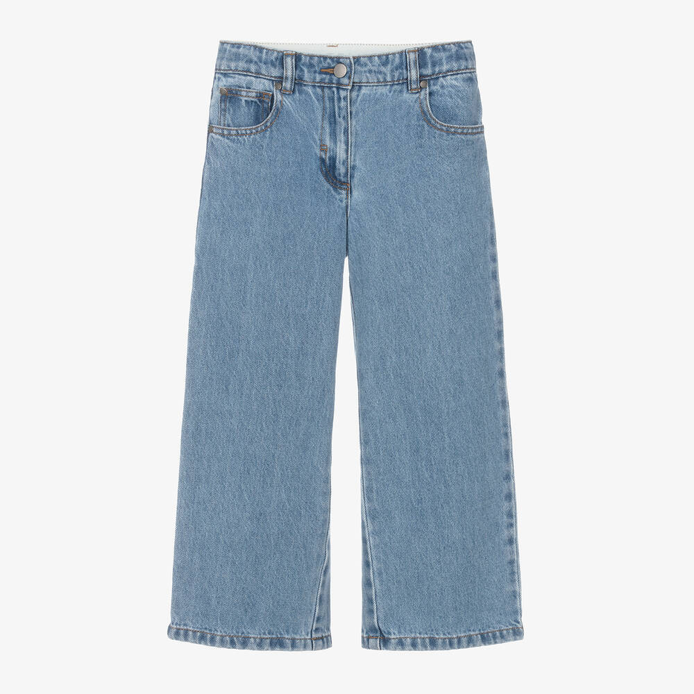 Wide-leg denim jeans for girls by Stella McCartney Kids, made in soft organic cotton. Casual but stylish, they have pockets on the front and back and classic contrast orange stitching. There is a large pink and orange heart-shaped logo appliqué on the back for a colourful branded statement. They fasten with a hook and zip and have a useful adjustable waist for a comfortable fit. The Stella McCartney fit can be quite small so choose a size up if you want room to grow.