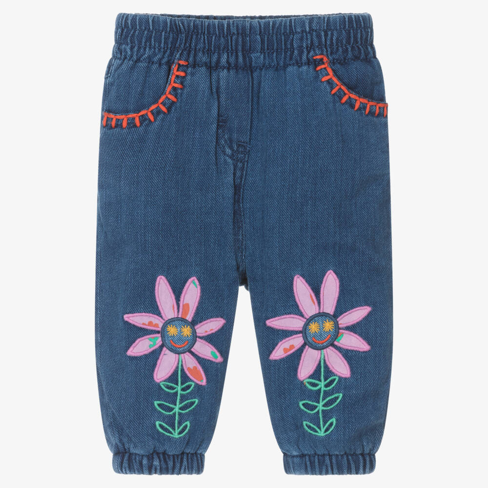 Lovely blue chambray trousers for little girls by British designer, Stella McCartney Kids. Made in soft organic cotton, they have bohemian-inspired embroidery on the legs and the pockets. Using brightly coloured thread, the embroidered flowers have happy, smiling faces for a cute look. For comfort, they have elasticated trims on the waist and cuffs, and a soft jersey lining. The Stella McCartney fit can be quite small so choose a size up if you want room to grow.