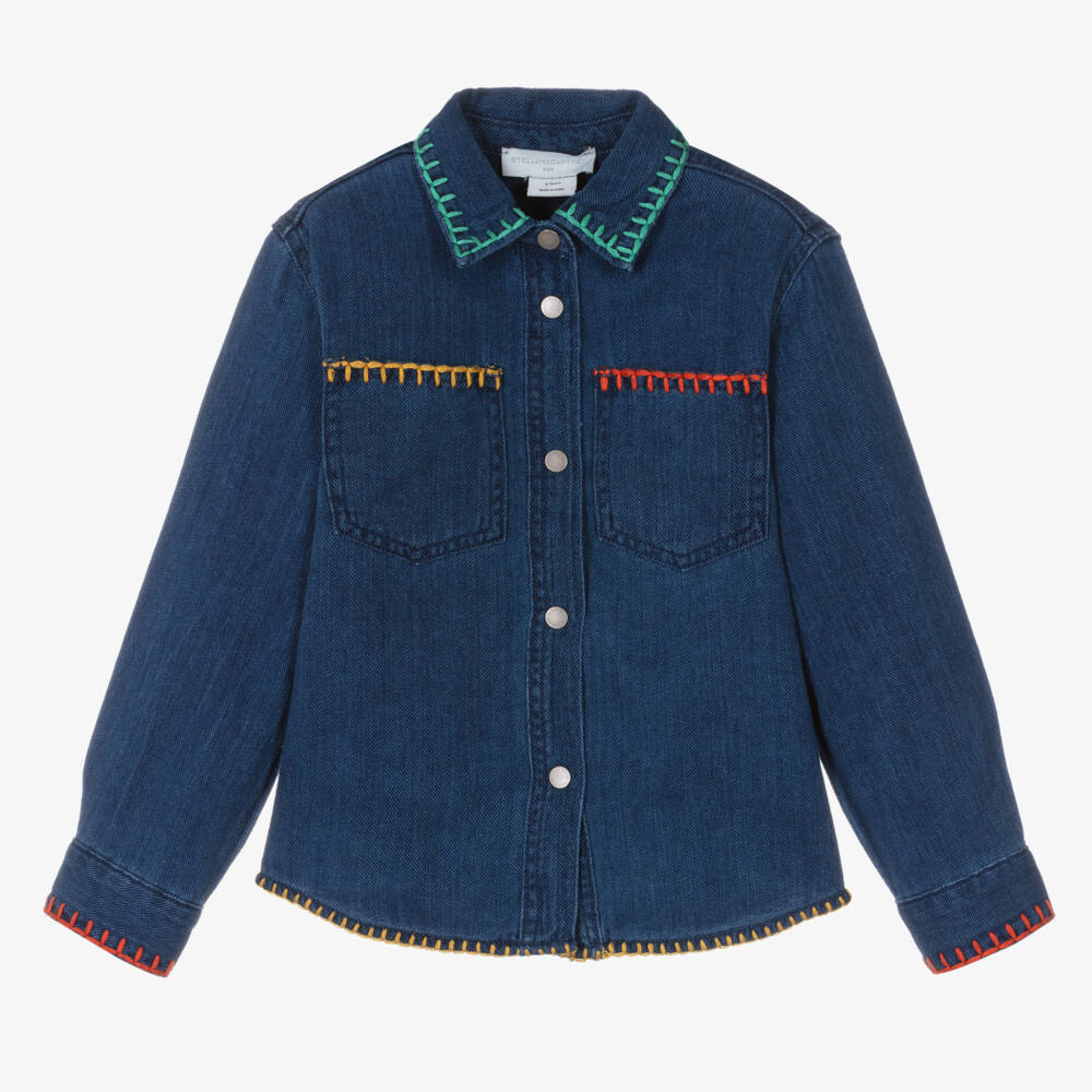 Charming blue shirt for girls by British designer Stella McCartney Kids, made in super soft, organic cotton denim. The collar, front patch pockets and cuffs all have colourful blanket stitching, whilst on the back is a gorgeous appliqué flower, with a happy, embroidered face. The shirt fastens with silver logo poppers on the front and cuffs. The Stella McCartney fit can be quite small, so choose a size up if you want room to grow.