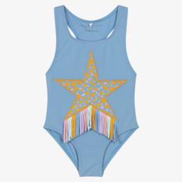 Sweet blue swimsuit for little girls by Stella McCartney Kids, with added stretch for comfort. It has a playful fairies print in pastel colours and a pretty ruffle trim with scalloped edges.