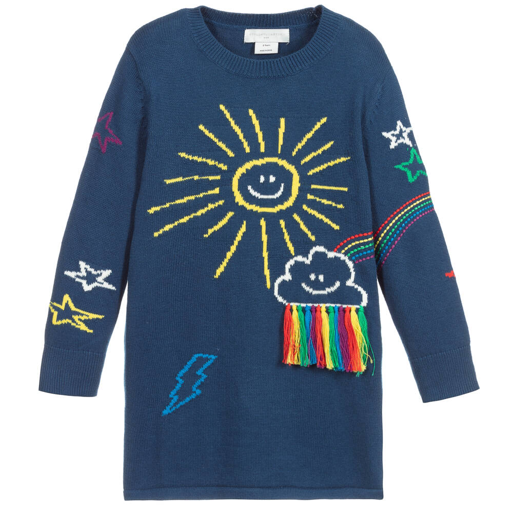 Blue dress for girls by Stella McCartney Kids, knitted in a blend of cotton and wool. It has a colourful weather themed pattern on the front and sleeves, with embroidered rainbows and rainbow coloured tassels attached to a cloud.