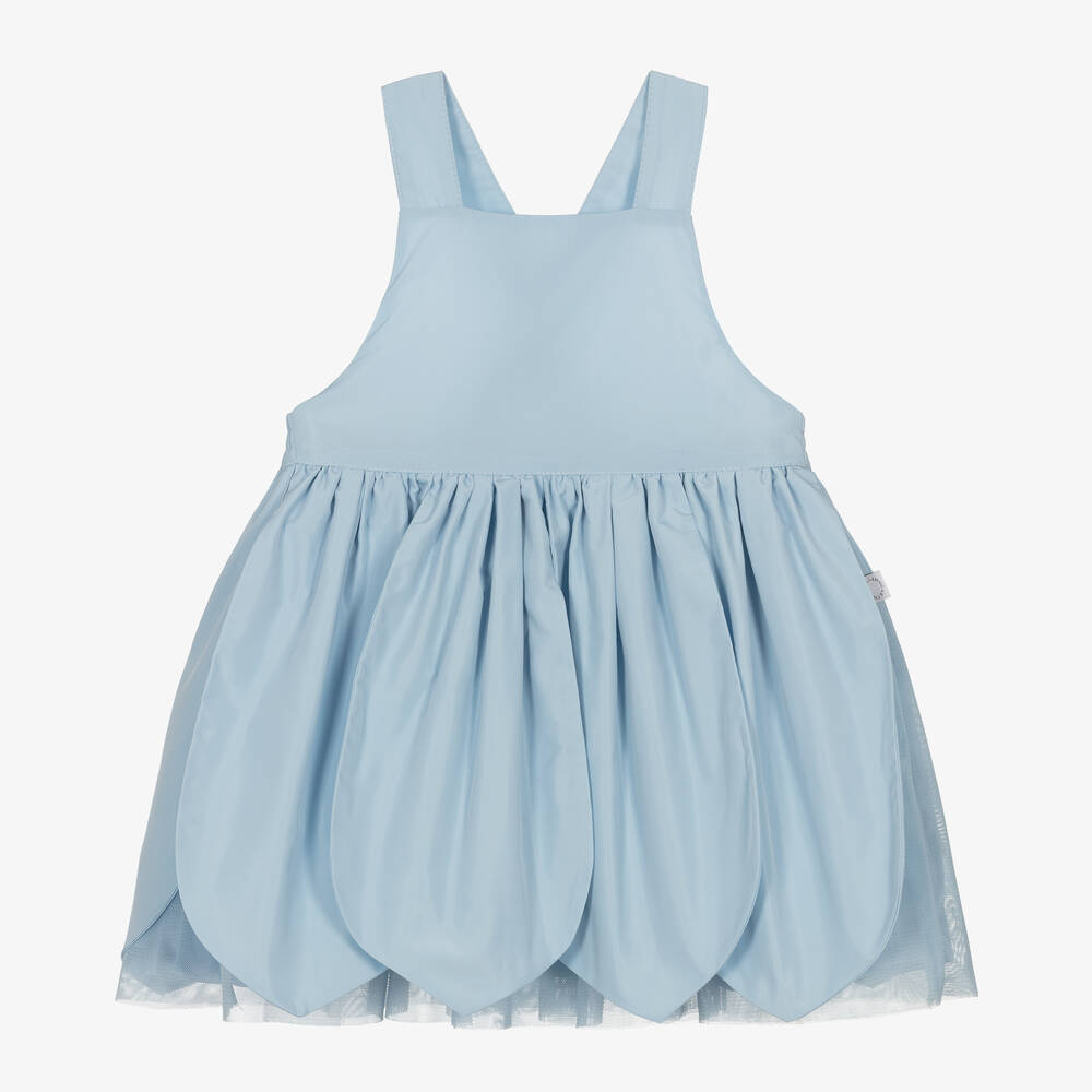 A silky smooth, pale blue dress for little girls by Stella McCartney Kids. This pretty design features a voluminous petal skirt, with a soft mesh underskirt and a lightweight viscose lining. The bib front has adjustable shoulder straps which secure with buttons on the elasticated back.