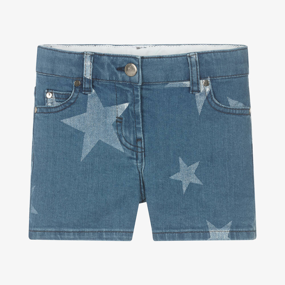 Mid-blue denim shorts for girls by Stella McCartney Kids, with a faded white star print. Made with organic cotton, this classic five-pocket design has a slight stretch for comfort. The waistband is adjustable for a great fit and a branded tab on the back gives a discreet designer finish. The Stella McCartney fit can be quite small so choose a size up if you want room to grow.