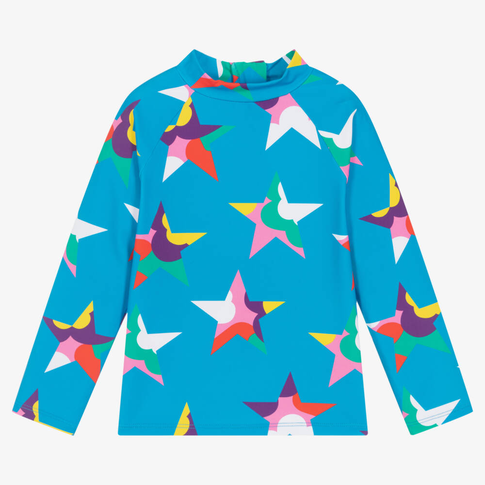 Quirky bright blue sun top for girls by Stella McCartney Kids, with UPF 50+. Silky and stretchy, it is made in recycled jersey, with cool star prints in an array of colours. Great for the pool or beach, this long-sleeved top has an easy-to-fasten zip on the back and sporty raglan sleeves.