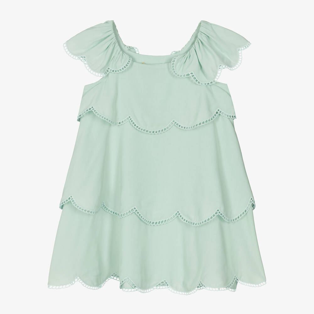 Designed by Stella McCartney Kids, this pale green dress for girls is made from sustainably sourced viscose. Soft and lightweight, each layer has pretty scallop-shaped edges and embroidered trims for a whimsical look, with frilled short sleeves. Comfortable to wear, this flowy style easily slips over the head. The Stella McCartney fit can be quite small so choose a size up if you want room to grow.