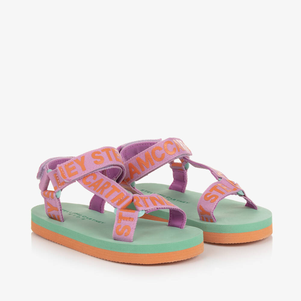 Fun and colourful, these green and purple sandals for girls are by Stella McCartney Kids. The woven textile straps are printed with a vibrant orange repeat logo design, with velcro fastenings around the ankle for an adjustable fit. The insole and outsole are made from lightweight foam for comfortable wear.