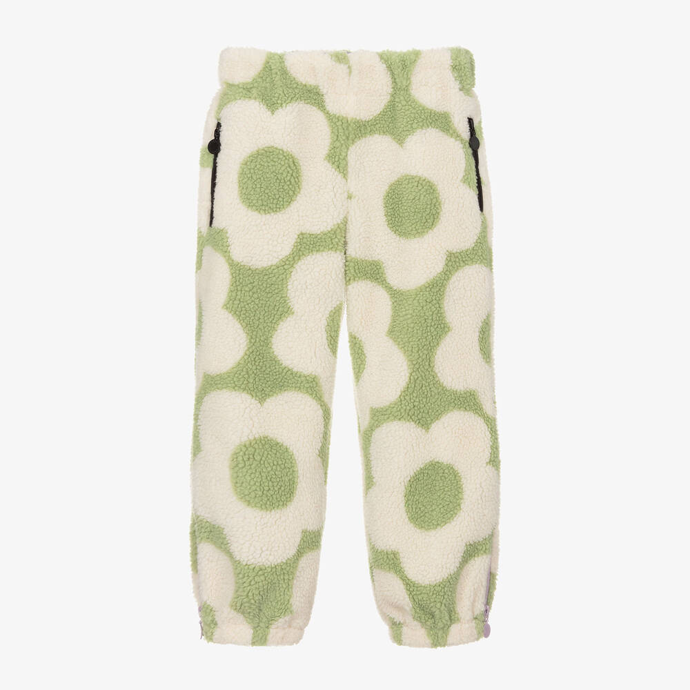 Casual green and ivory joggers for girls by Stella McCartney Kids, featuring a bold graphic flower pattern. Warm and comfortable, they are made in thick sherpa fleece, with a soft jersey lining and a gently elasticated waist. There are black zipped pockets and lilac purple zipped ankles, each with branded pullers for a subtle designer touch. The Stella McCartney fit can be quite small so choose a size up if you want room to grow.
