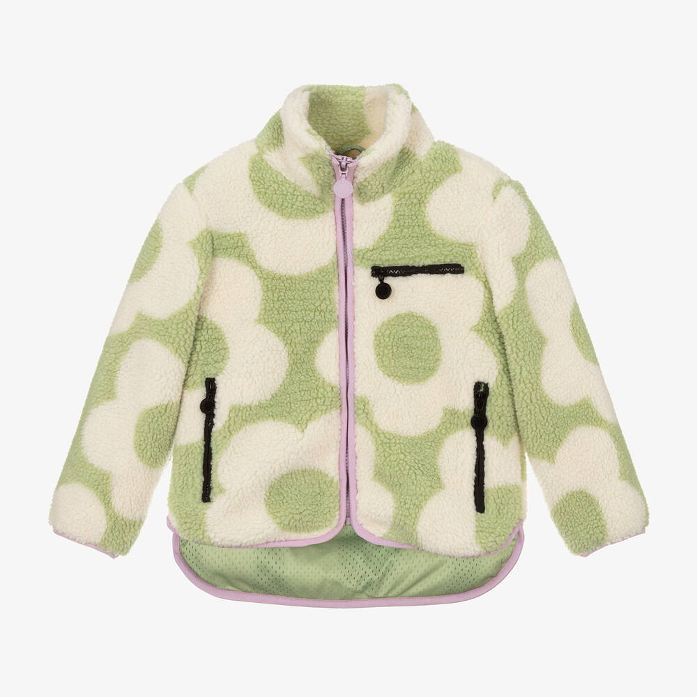 Casual green and ivory zip-up top for girls by Stella McCartney Kids, featuring a bold graphic flower pattern. Warm and comfortable, it is made in thick sherpa fleece, with a high collar and a soft mesh lining. There is a lilac purple front zip fastening and black zipped pockets, each with branded pullers for a subtle designer touch. The Stella McCartney fit can be quite small so choose a size up if you want room to grow.