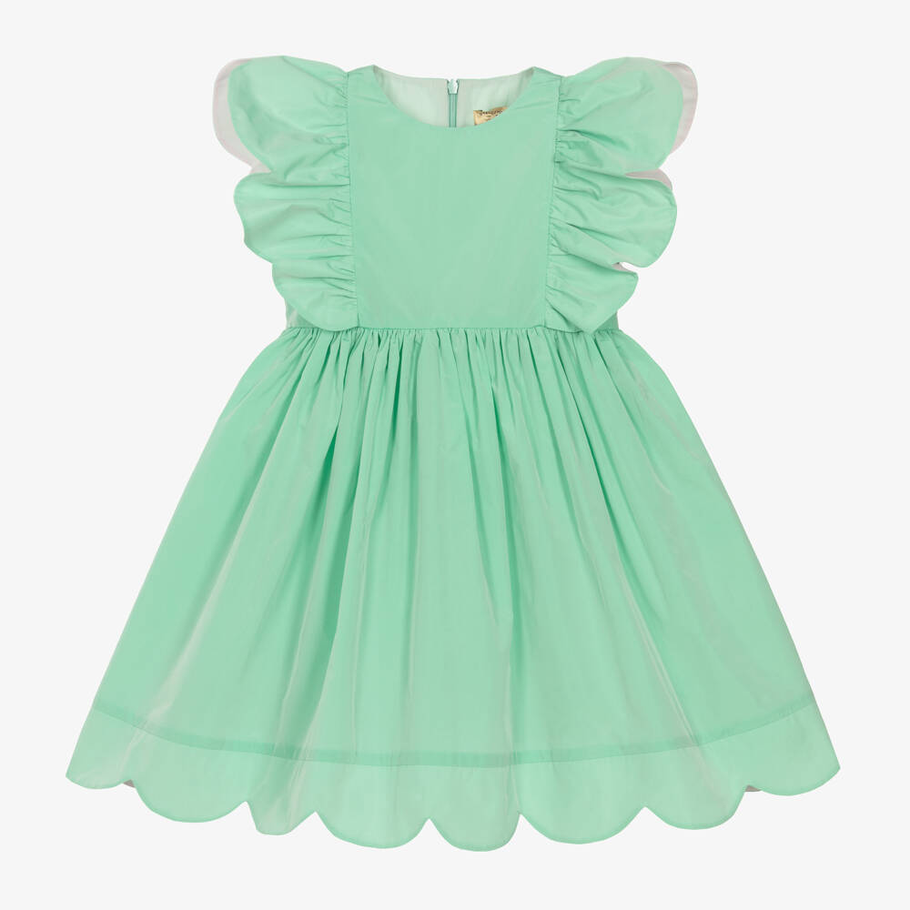 A pastel green special occasion dress for girls from Stella McCartney Kids, made from smooth taffeta with a lustrous sheen. The dress is styled with a full skirt and pretty scalloped trim, with beautiful ruffles decorating the bodice and shoulders. It is lined in soft cotton for comfort and fastening neatly on the back with a concealed zip. The Stella McCartney fit can be quite small so choose a size up if you want room to grow.