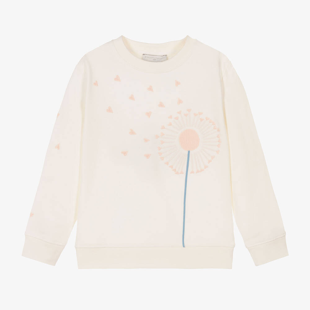 Lovely ivory organic cotton sweatshirt for girls by British brand Stella McCartney Kids, with a beautifully embroidered flower and hearts on the front in pink and blue. It is made in soft, comfortable jersey with a cosy, fleecy inside and neat, ribbed trims on the long sleeves. The Stella McCartney fit can be quite small so choose a size up if you want room to grow.