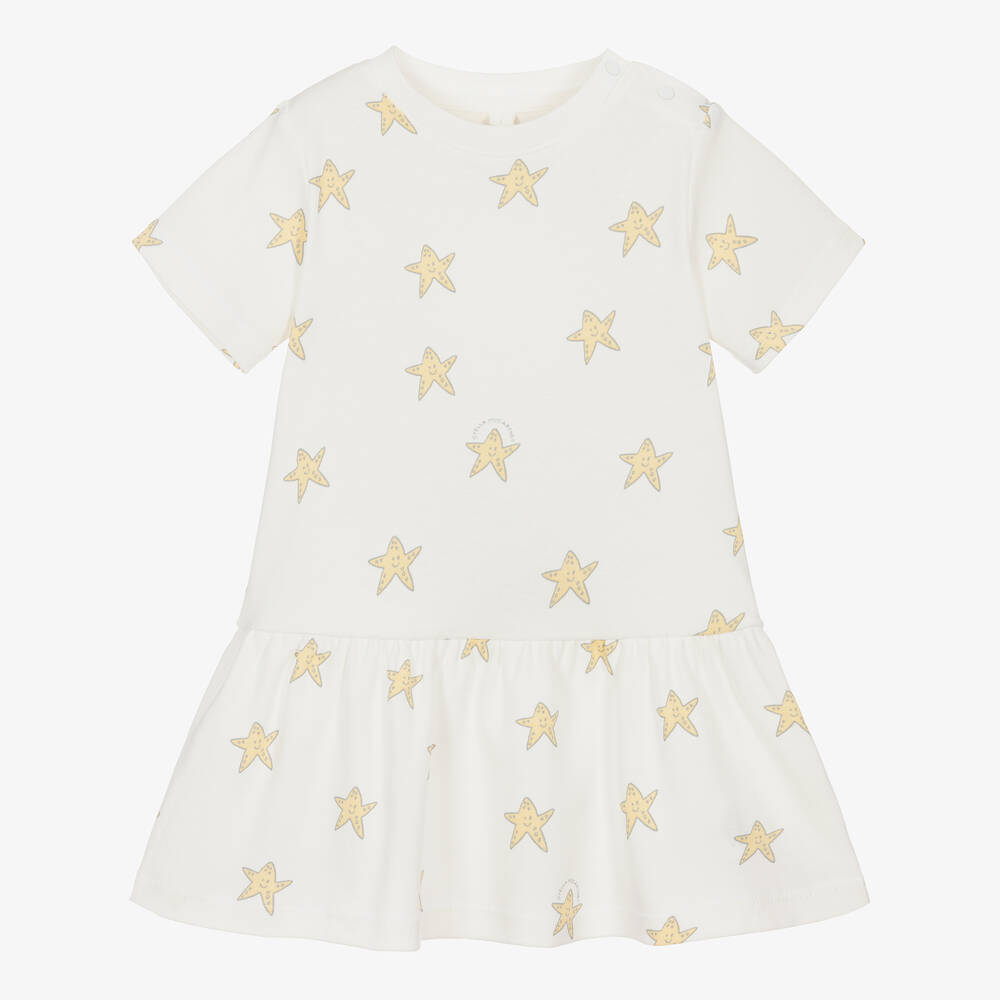 An ivory dress for little girls by Stella McCartney Kids, with a cute yellow starfish pattern. Made from super soft organic cotton jersey, this dropped-waist dress has a frilled skirt and short sleeves. There are popper fastenings on one shoulder for easy dressing. The Stella McCartney fit can be quite small so choose a size up if you want room to grow.