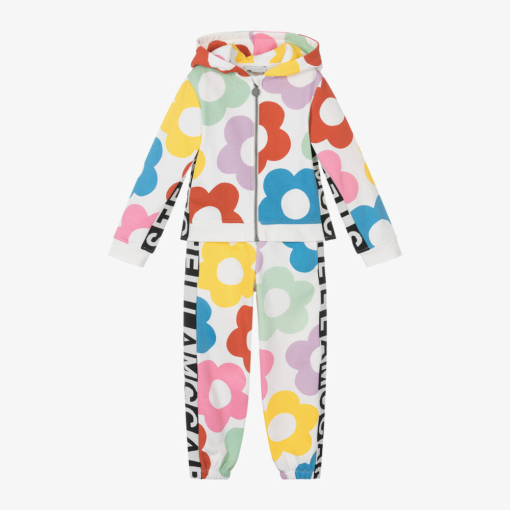 Casual and comfortable for girls, this ivory tracksuit is by Stella McCartney Kids. Made in soft organic cotton blend jersey with a warm fleecy inside, it has a bold flower pattern with logo tape trims for a distinctive look. The hooded top has an exposed front zip fastening, with a branded puller for an extra designer touch. The joggers have a gently elasticated waist and ankle cuffs, with useful side seam pockets. The Stella McCartney fit can be quite small so choose a size up if you want room to grow.