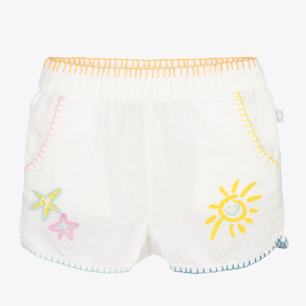 Sweet ivory shorts for little girls by Stella McCartney Kids, with colourful blanket stitch trims. Both the back and front are embroidered with a yellow smiling sun and a pair of green and pink starfish. Woven in a lightweight linen and cotton blend, these playful shorts have four pockets and an elasticated waist for easy pull on. The Stella McCartney fit can be quite small so choose a size up if you want room to grow.
