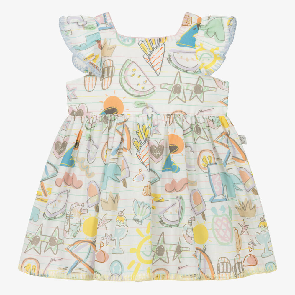 A playful ivory dress for little girls by Stella McCartney Kids, patterned in beach-inspired prints in pastel colours. Woven in lightweight organic cotton with fun blanket stitch trims, it has pretty flutter sleeves and a gently gathered skirt. It fastens with buttons on the back, and comes with a pair of matching knickers. The Stella McCartney fit can be quite small so choose a size up if you want room to grow.