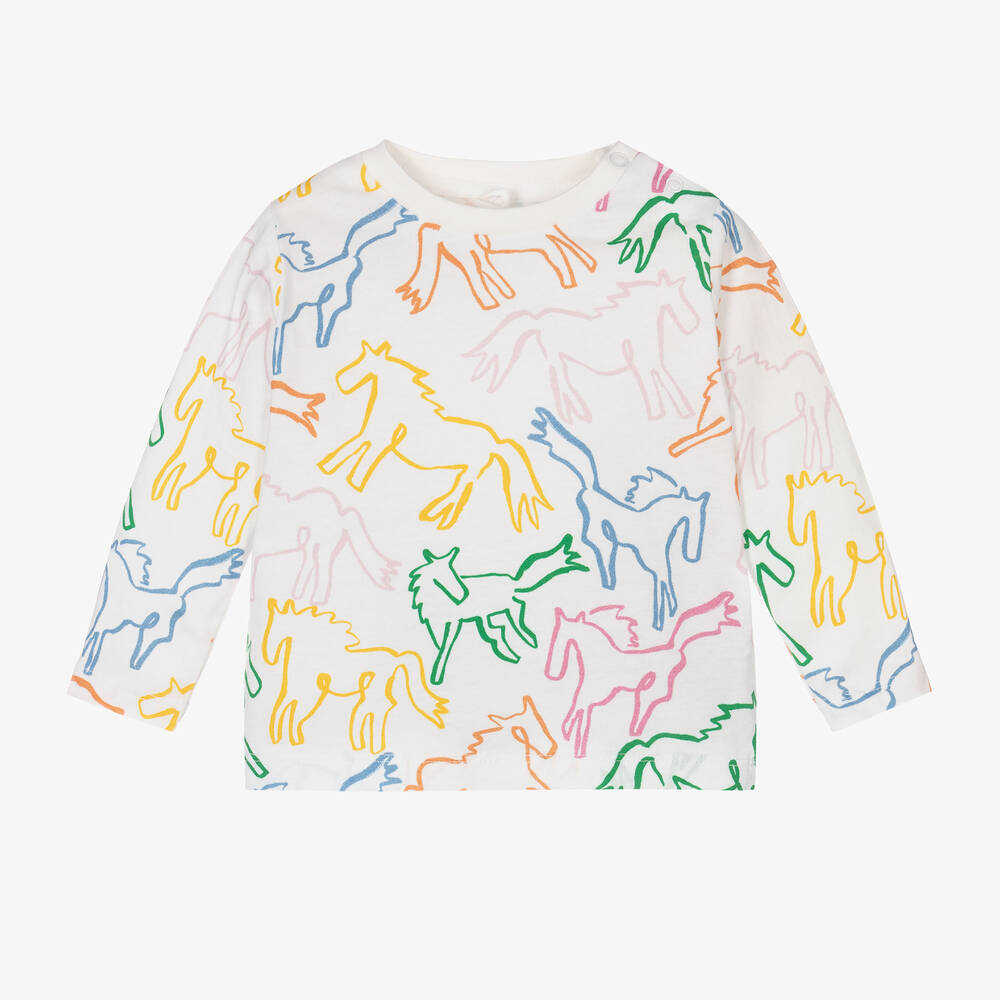 Ivory organic cotton top for younger girls by British brand Stella McCartney Kids, patterned with colourful horse outlines. Made in soft jersey for comfortable wear, it is casually styled with a crew neckline and long sleeves. There are useful popper fastenings on one shoulder to help with dressing. The Stella McCartney fit can be quite small so choose a size up if you want room to grow.