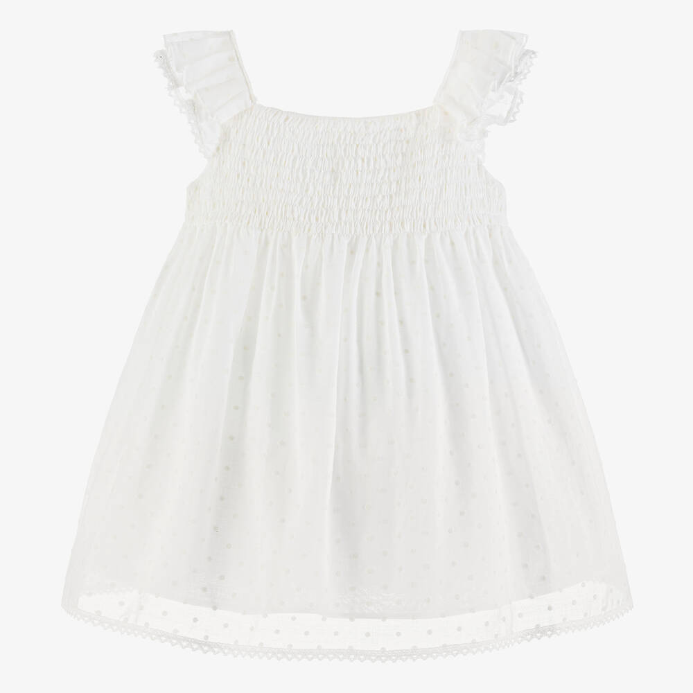 A charming ivory dress for little girls by Stella McCartney Kids. Made from lightweight organic cotton voile with a tonal flocked polka dot pattern, it has a shirred bodice, ruffled sleeves and lace trims. Fully lined, it fastens with a neat, concealed zip on the back. The Stella McCartney fit can be quite small so choose a size up if you want room to grow.